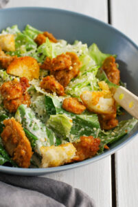 - Huuhtele ja pilko salaatit. Kaada kastike salaatin joukkoon ja kääntele hyvin. Kokoa annos salaatista, vegekanasta ja krutongeista. Ripottele päälle vegaanista parmesaania.